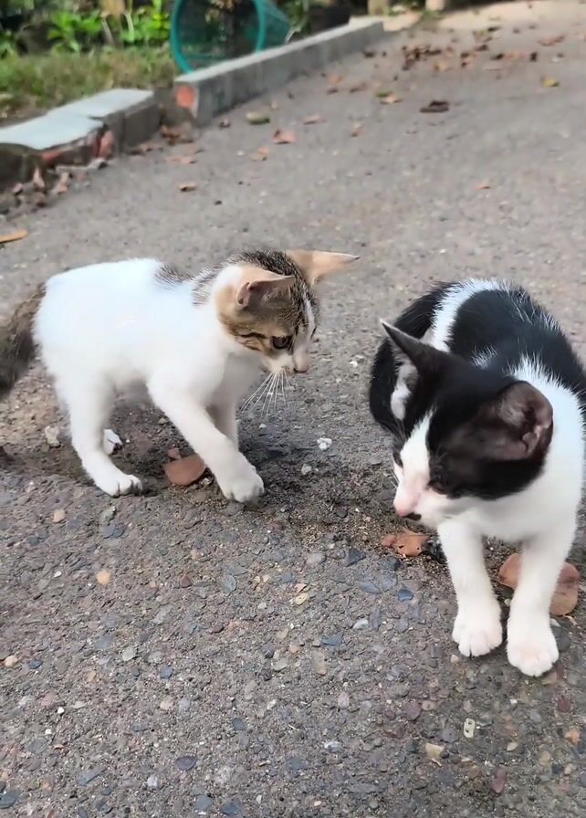 two kittens playing on an asphalt surface. One kitten is mostly white with brown and black patches on its head and back, and the other is black and white. The white and brown kitten is batting at the black and white kitten with its paw. Both kittens are small and appear to be young. The background includes green vegetation and a partially visible white fence with a decorative pattern. Several fallen leaves are scattered on the asphalt.