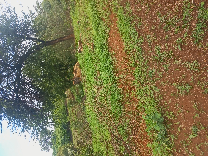 A sunlit grassy field is divided by a red soil path. A tree with branches stretching out to the left dominates the scene. Beside the tree, a tan cow rests in the grass. Vegetation is dense and covers most of the landscape except for the well-worn path and patches of red soil.