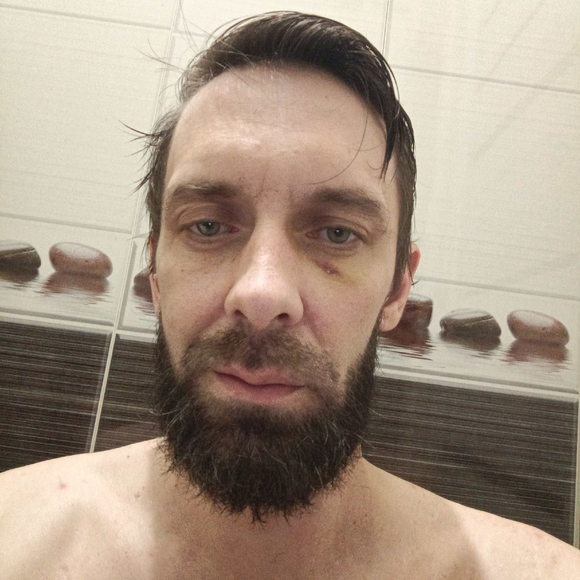 A close-up selfie of a man with wet hair and a full beard. He has a visible bruise under his left eye. The background consists of tiled walls decorated with a horizontal band featuring images of smooth stones in water. The man appears to be shirtless. No other identifying information about the location or activity is discernible from the image. The location in Марковский, Russia, cannot be confirmed.