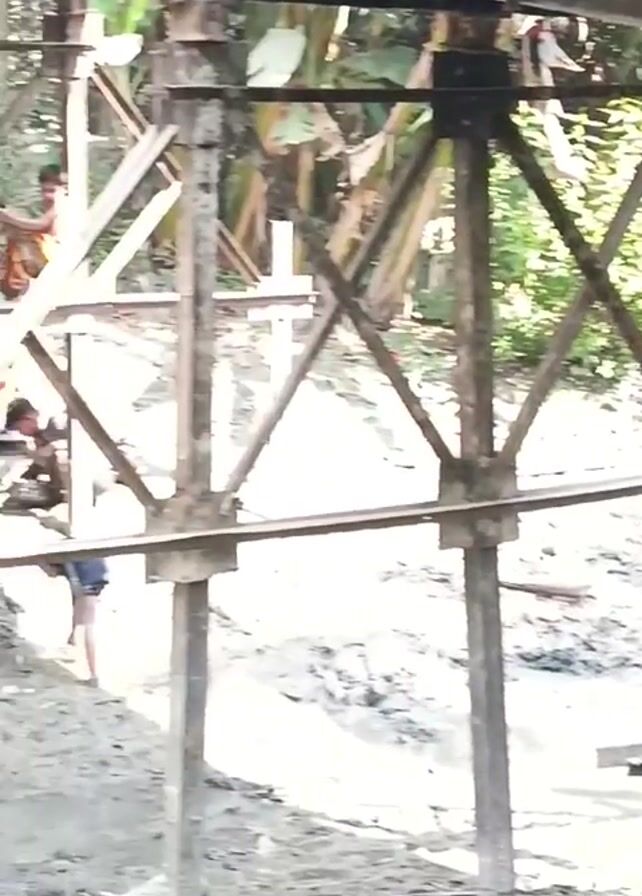 two children sitting on a makeshift wooden platform under a dilapidated bridge or elevated structure. Other figures are visible on the bridge as well as standing in the mud below. The bridge is supported by metal beams and columns, and the surrounding environment appears to be a muddy, possibly overgrown area. One child is wearing a blue long-sleeved shirt and patterned pants, while the other is in a short-sleeved blue shirt. Both children are barefoot. The overall setting suggests a poor or rural area.