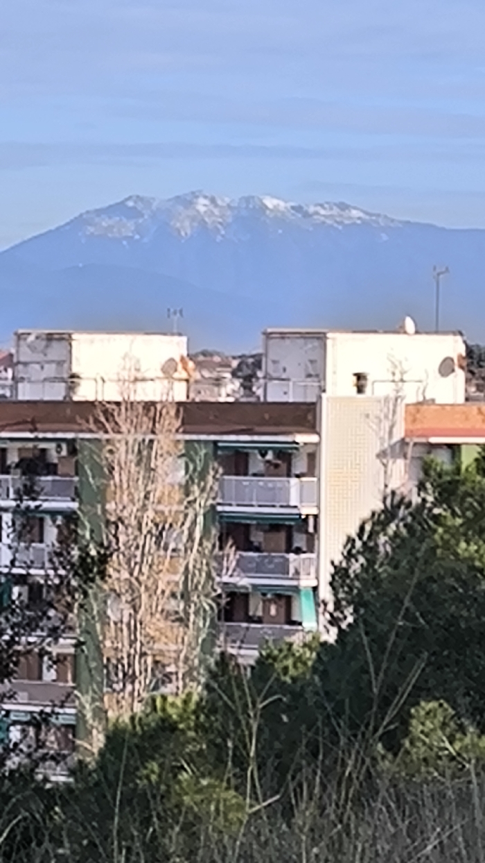The image displays an urban landscape in Cerdanyola del Vallès, Spain, under a clear, light blue sky. In the distant background, a mountain range is visible, featuring scattered snow patches on its peaks. The midground is dominated by multiple multi-story residential buildings. Several flat rooftops are present on the upper building sections, equipped with various television antennas and satellite dishes. Balconies, some with green awnings, are discernible on the lower floors of these structures. The foreground consists of dense vegetation, including leafless deciduous trees and evergreen shrubs, partially obscuring the lower portions of the buildings. No human figures or active vehicles are evident within the scene.