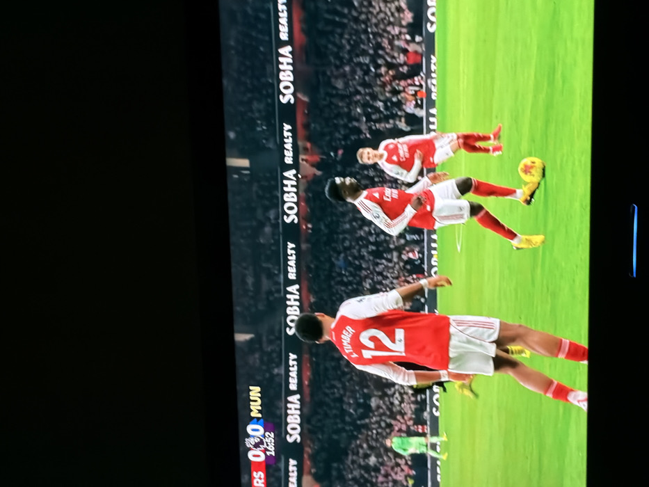 A TV screen shows a soccer match in progress. The score is 0-0 between ARS (Arsenal) and MUN (Manchester United). The clock reads 16:52. Three players wearing red and white uniforms are visible on the green pitch with a soccer ball. One player, wearing number 12 labeled “TIMBER”, is prominent. The advertising banner "SOBHA REALTY" is displayed along the side of the field, behind the crowd of spectators.