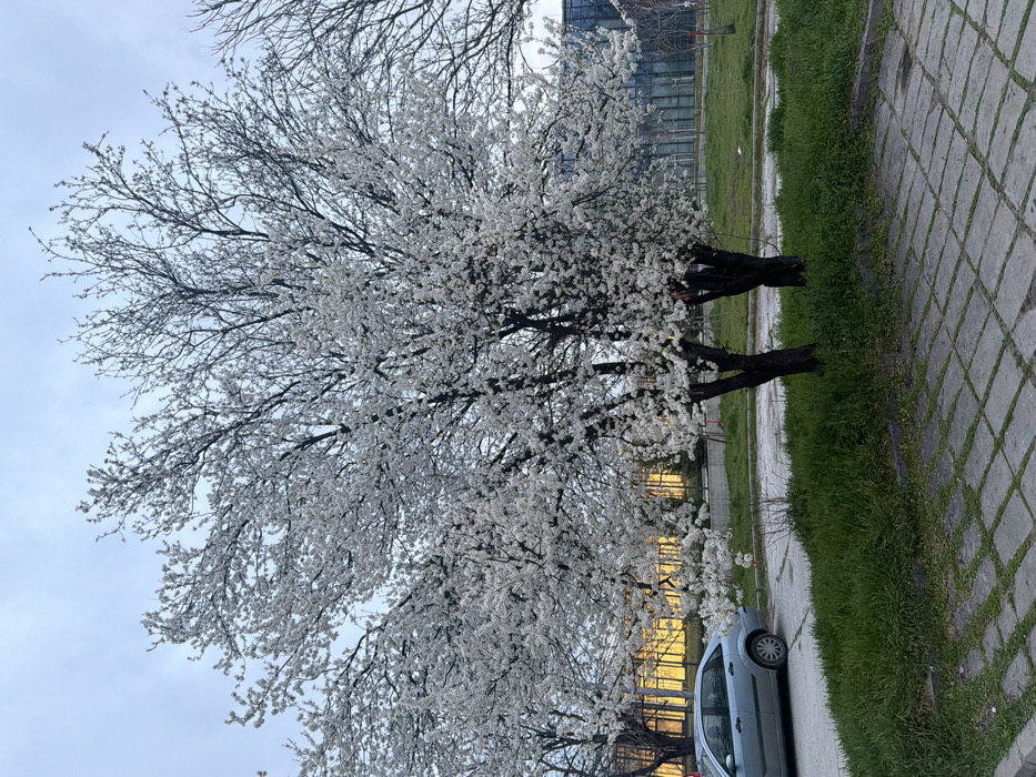 The image depicts an urban outdoor scene in Plovdiv, Bulgaria, during what appears to be daylight under an overcast sky. A large deciduous tree, fully adorned with white blossoms, stands prominently in the center-right foreground. Its dark brown trunk splits into two main sections near the ground, surrounded by a patch of green grass. In the immediate foreground, a paved surface composed of light-colored square concrete pavers with grass growing in the interstices is visible. To the left, a light blue/silver Ford Focus sedan is parked on a darker, unpaved or asphalt surface, partially obscured by another blossoming tree. In the background, to the left, a building with illuminated windows or a facade reflecting warm light is discernible. To the right, a modern building featuring a reflective glass facade is visible through the branches of the central tree. No human figures are present in the frame.