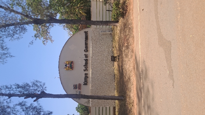 An outdoor, eye-level forensic image captures the entrance to the Kenya School of Government in Waa Ngombeni ward, Kenya, under a clear blue sky
