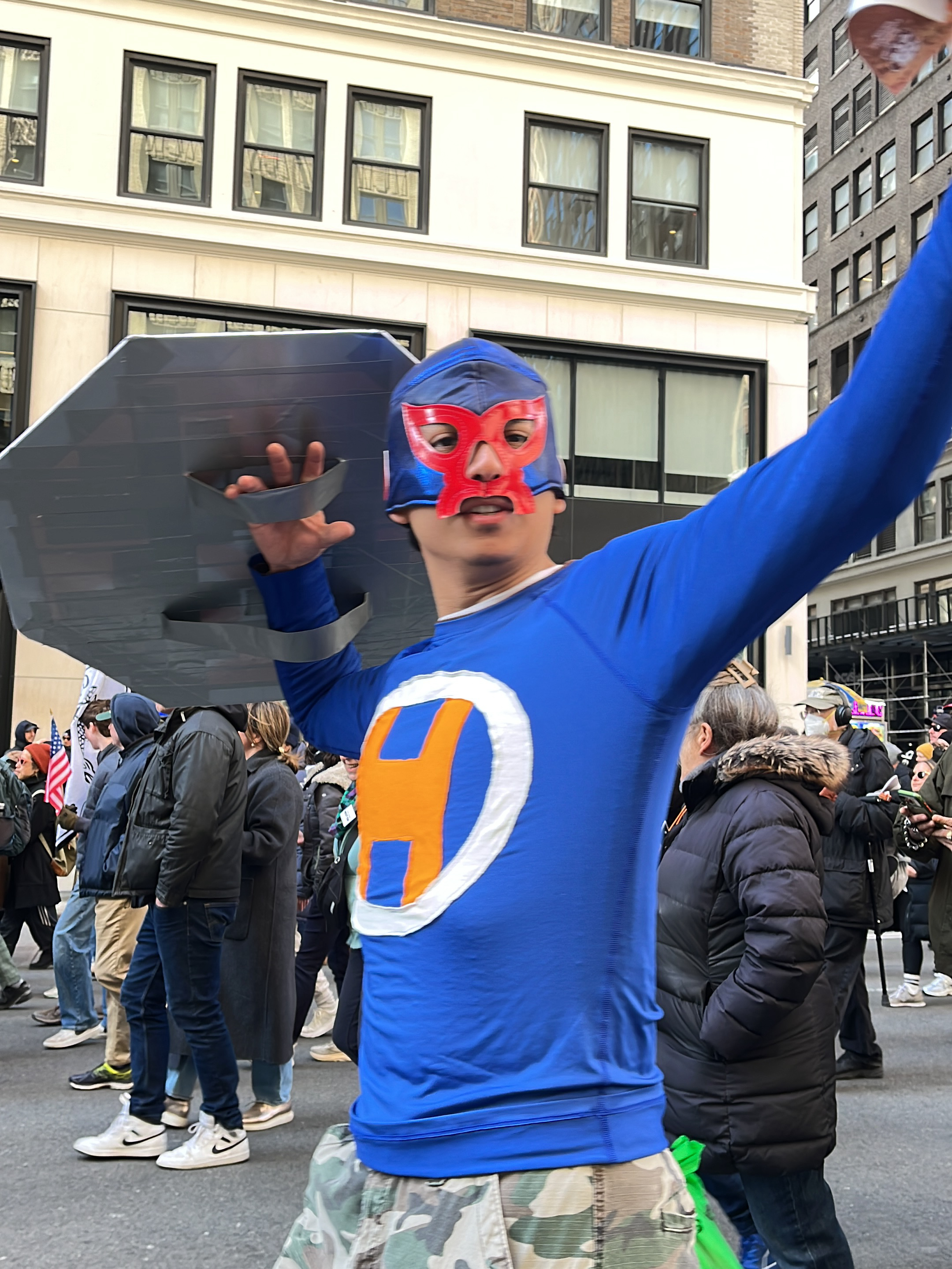A man dressed in a blue superhero costume with a red mask and a shield is standing in a crowd of people in New York City. The man is wearing a blue long-sleeved shirt with a white circle and an orange "H" on the front. He is also wearing camouflage pants and holding a grey shield in his left hand. The crowd is standing on a city street lined with tall buildings. The buildings are made of white stone and have many windows. Some people in the crowd are wearing winter clothes, such as jackets and hats. There are buildings in the background, and it's during the daytime.