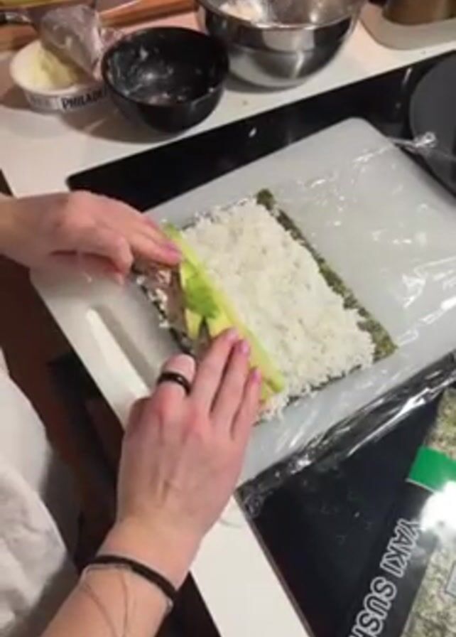 person making sushi on a white countertop