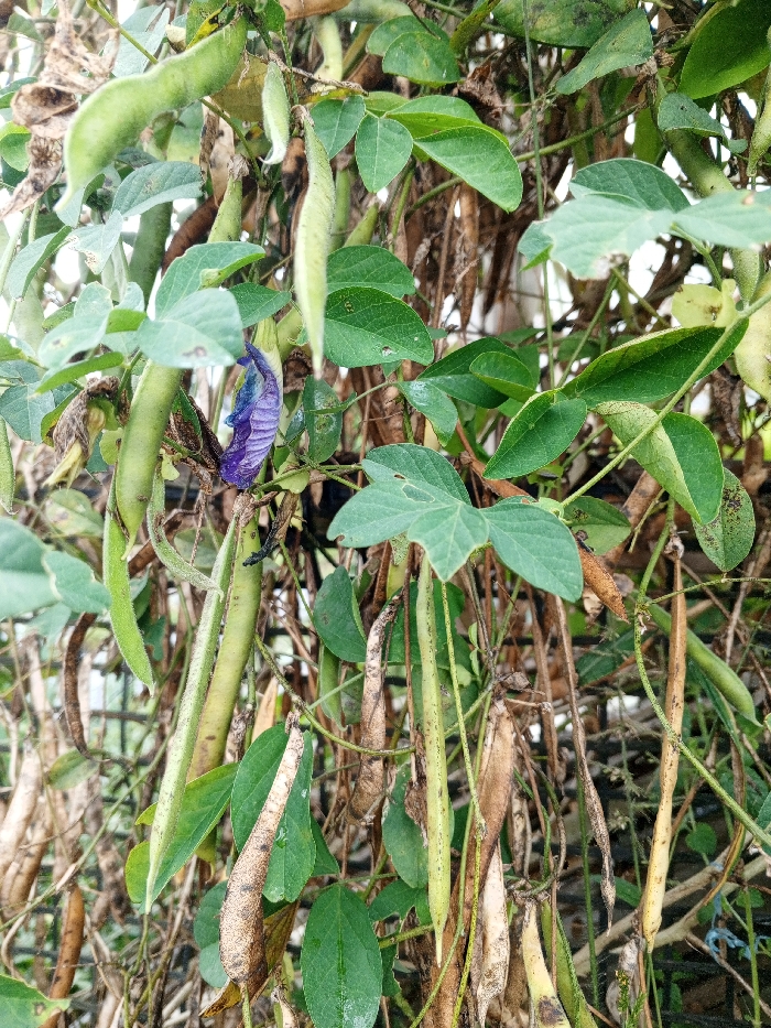 A tangled bean plant thrives with lush green leaves and elongated bean pods, some plump and vibrant green, others dried and brown. A striking indigo flower blooms amidst the foliage, contrasting with the predominantly green and brown hues. The plant's density is apparent, and the pods range from mature, ready-to-harvest to withered and dried. The background is slightly out of focus, hinting at a support structure or fence.