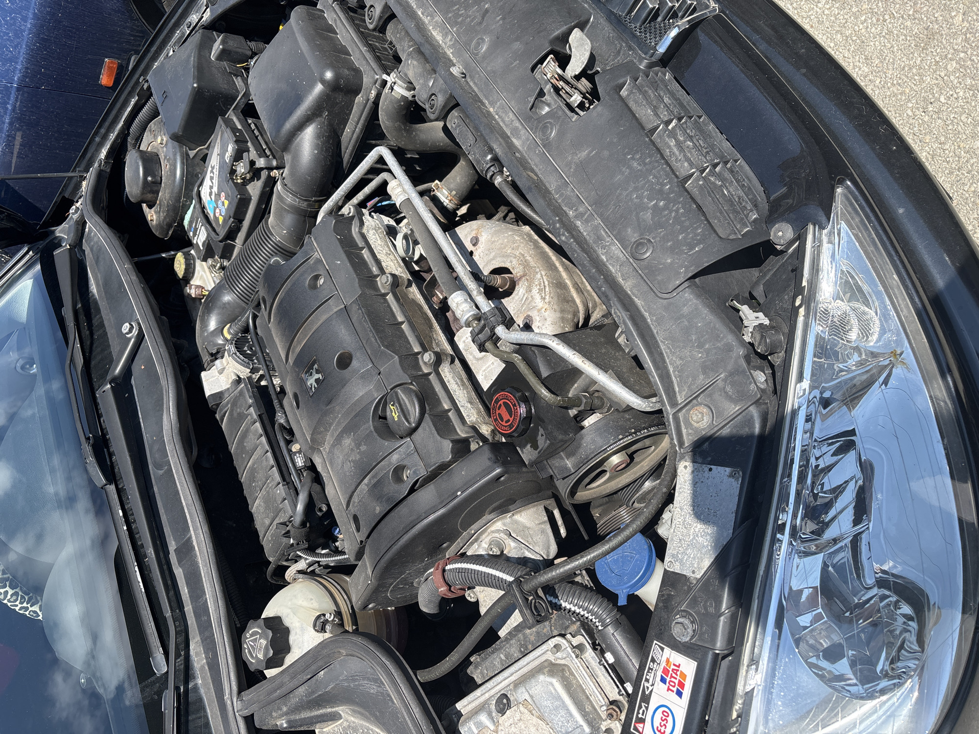 engine bay of a car, likely a Peugeot 207, in daylight