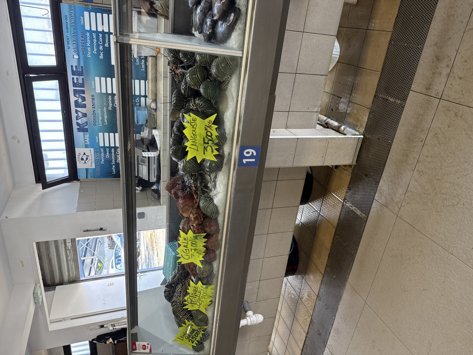 This image depicts the interior of a fish market stall in Noumea, France