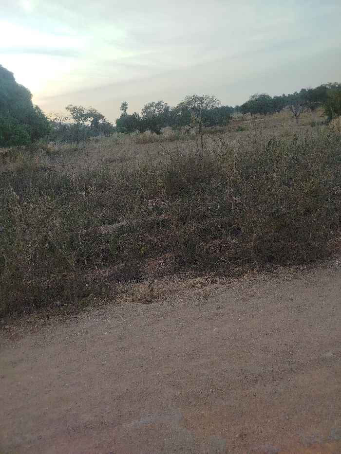 The image displays an undeveloped landscape within Vana, Nigeria. The immediate foreground consists of a light brown, granular dirt path, which occupies the lower quarter of the frame. Directly beyond the path lies a dense expanse of dry, mixed vegetation, characterized by dark green and brown scrub brush and withered grasses, extending across the mid-ground. Further into the background, the terrain gently ascends, revealing an area of sparse, light brown vegetation and exposed earth, punctuated by scattered trees with dark green foliage. A prominent mass of dense, dark green foliage, potentially a hill or forest, is visible on the far left. The sky is uniformly pale blue-grey, indicating overcast conditions or twilight. No individuals, animals, or artificial structures are discernible within the scene.