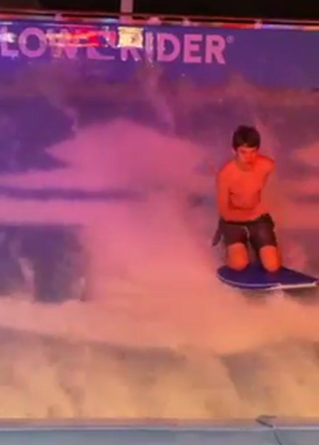 - "A young shirtless man is riding a FlowRider artificial wave machine on his knees" by FM-Q2QzL2, licensed under CC BY 4.0
