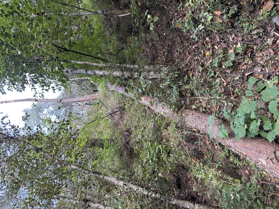A serene forest scene features slender white trees juxtaposed against the backdrop of verdant foliage. A large, fallen tree dominates the right side of the frame, partially covered by smaller plants and dry leaves. The scene has a natural color palette with light filtering through the tree branches, creating an intimate and peaceful atmosphere in a wooded area.