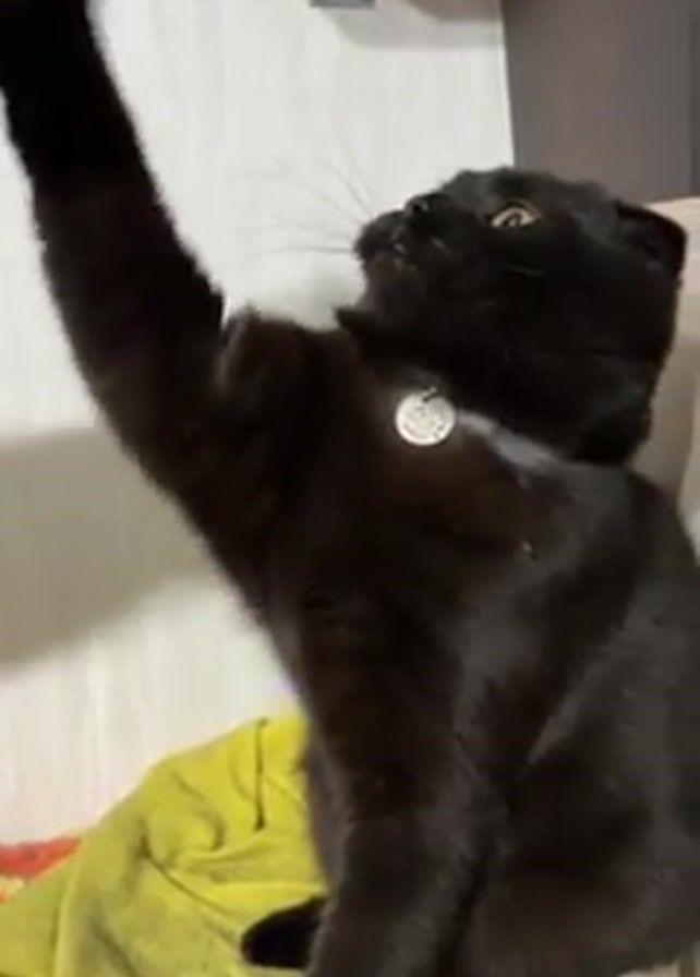 A close-up shot captures a black cat sitting on a yellow blanket. The cat, wearing a silver collar tag, repeatedly reaches up with its right paw toward a person's hand. The background consists of a white and dark brown wall. The cat appears to be playing or attempting to touch the hand. A voice says "Petyun'ya" in Russian.