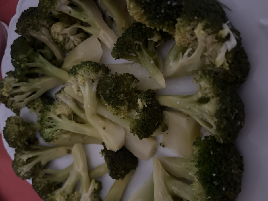 The image displays a close-up, overhead view of prepared food on a white, round plate. The primary subject is multiple florets of cooked broccoli, varying in size, with distinct green heads and paler green-to-yellow stems. Many pieces exhibit a fine, white granular substance, likely salt or seasoning, distributed across their surface. Interspersed among the broccoli florets are several irregularly shaped, pale yellow to off-white pieces of a root vegetable, possibly potato or turnip, which also appear cooked. The food items are scattered across the plate, forming a roughly circular arrangement. The plate has a visible scalloped or ridged edge in certain areas. The background is out of focus and appears to be a reddish-brown surface, likely a tablecloth or table. No people, specific actions, or interactions are visible. The specific location in the city of Le Puy-en-Velay, France, cannot be determined from the visual information provided.