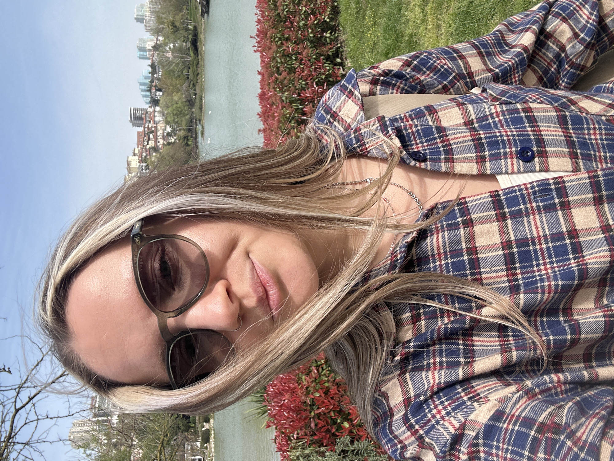 A woman is posing for a selfie in what appears to be a park in Başakşehir, Turkey. The background features a body of water, likely part of Başakşehir Göleti (Başakşehir Lake), and buildings that might be residential or commercial structures characteristic of the area. The woman is wearing sunglasses and a plaid shirt, and she has blonde hair. The surrounding environment includes greenery, specifically reddish bushes and grass, common in urban parks. The weather is clear and sunny.