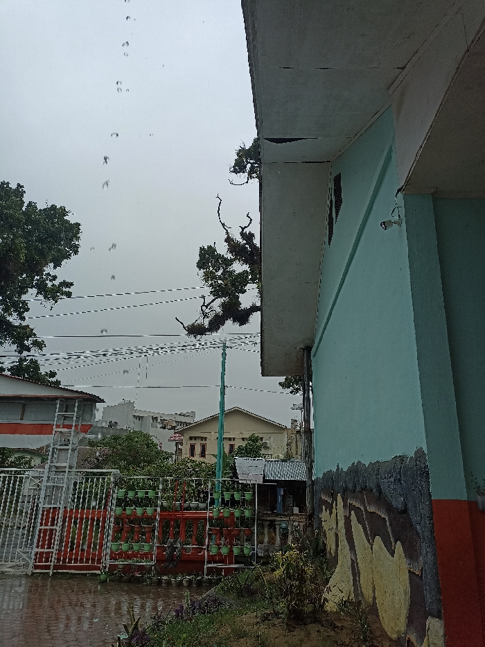 A rainy outdoor scene shows a building corner painted light blue with faux rock paneling. A security camera is mounted on the wall. In the background, a gated garden with potted plants and a ladder is visible, along with residential buildings and a beige structure. Trees overhang the scene, and raindrops are visible on the lens. Power lines cut across the sky, which is overcast and grey. The general atmosphere suggests a cloudy, possibly urban, environment.