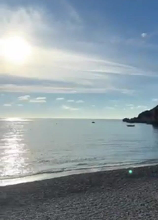 pebble beach, on a sunny day, with a blue sky. The water is calm with the sun reflecting on it. There is a hill with trees and a small building on the far right. The camera pans along the beach to the left, revealing a stone wall and a town on the hill in the distance.