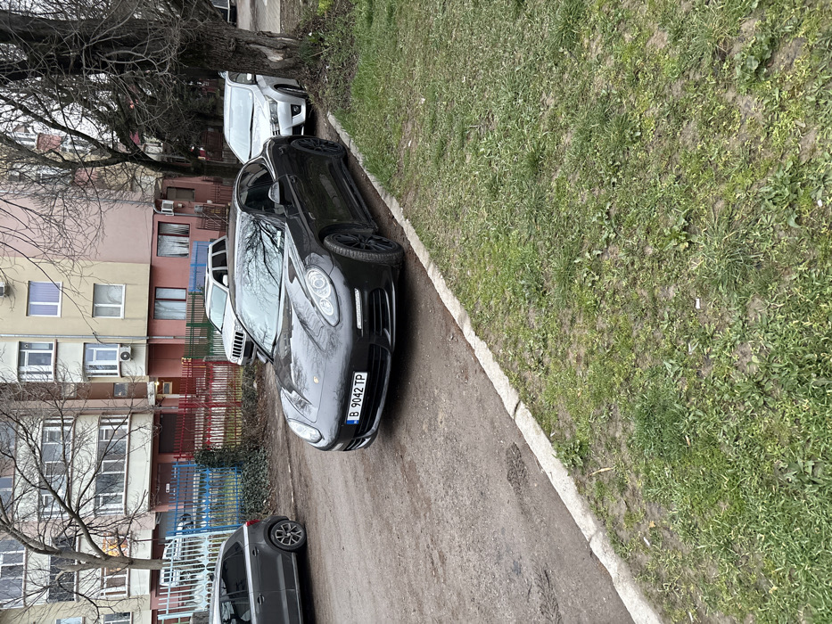 The scene depicts an urban residential street in Targovishte, Bulgaria, under an overcast sky. The foreground features a strip of unkempt grass and weeds bordering an unpaved dirt road, separated by a concrete curb. A dark grey Porsche Panamera sedan, with Bulgarian license plate "B 9042 TP", is prominently parked on the dirt road, facing to the left, parallel to the curb. The vehicle has black multi-spoke wheels and shows minor surface reflections. In the mid-ground, a grey Volkswagen Polo hatchback is partially visible further down the dirt road to the left. Behind the Porsche, separated by a colorful metal fence with blue lower and red upper sections, a white Jeep Grand Cherokee SUV is parked. To the right of the Porsche, a silver Toyota Corolla sedan is parked on a paved section of a sidewalk, adjacent to a bare deciduous tree. Additional bare trees are scattered throughout the background. The background features a multi-story residential apartment building with varying facade colors including pale pink, light yellow, and beige sections. The building has multiple windows and balconies, and an external air conditioning unit is visible on the pink section. No individuals are present in the scene; all vehicles are stationary.