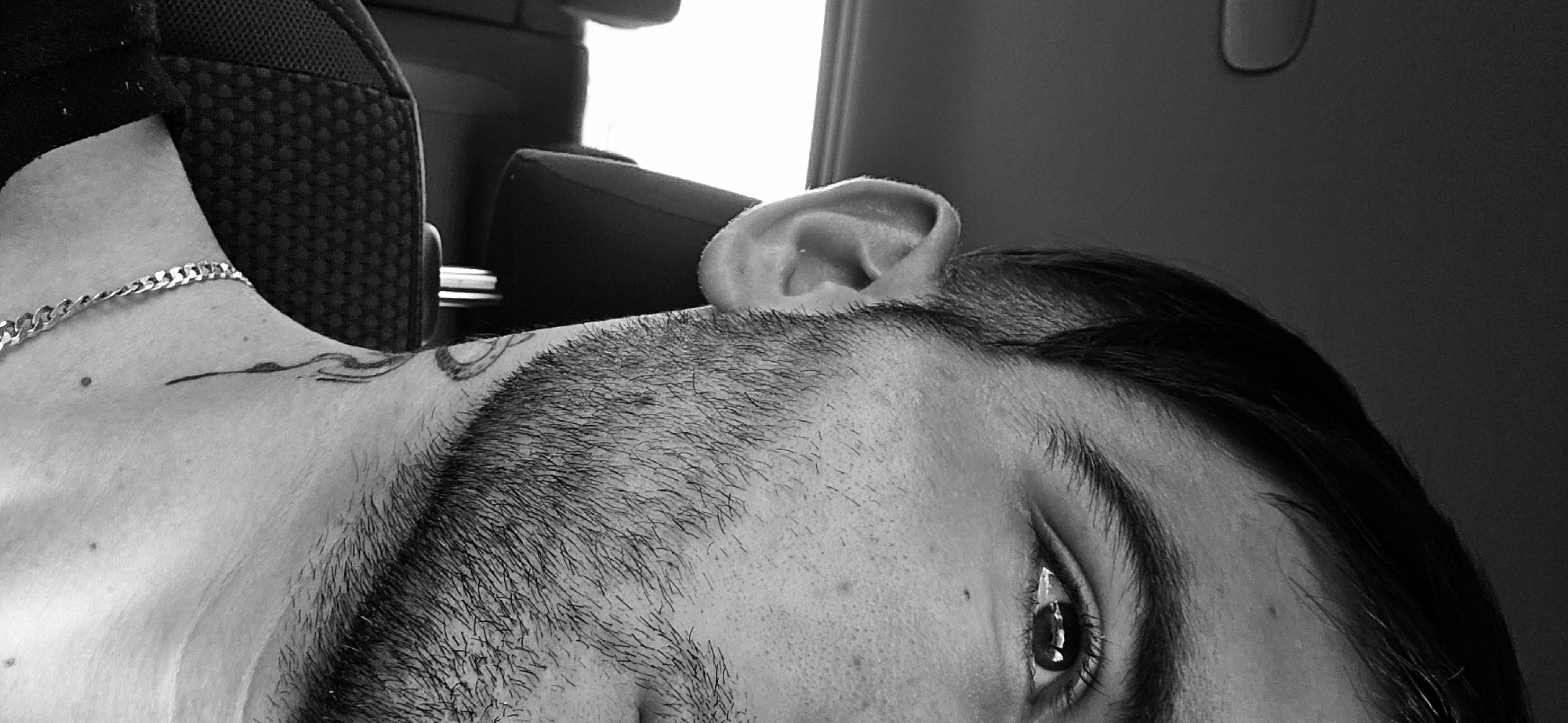 A close-up black and white image depicts the side of a man's head and neck. He has short, dark hair and a beard, and an ear is visible near the top of the frame. One eye is open, with visible eyebrow and eyelashes. A silver chain rests on his neck. Tattoos are visible on the neck and upper chest area. The background contains elements of a vehicle interior, including a headrest and window. There is no indication of Zvanichevo, Bulgaria.