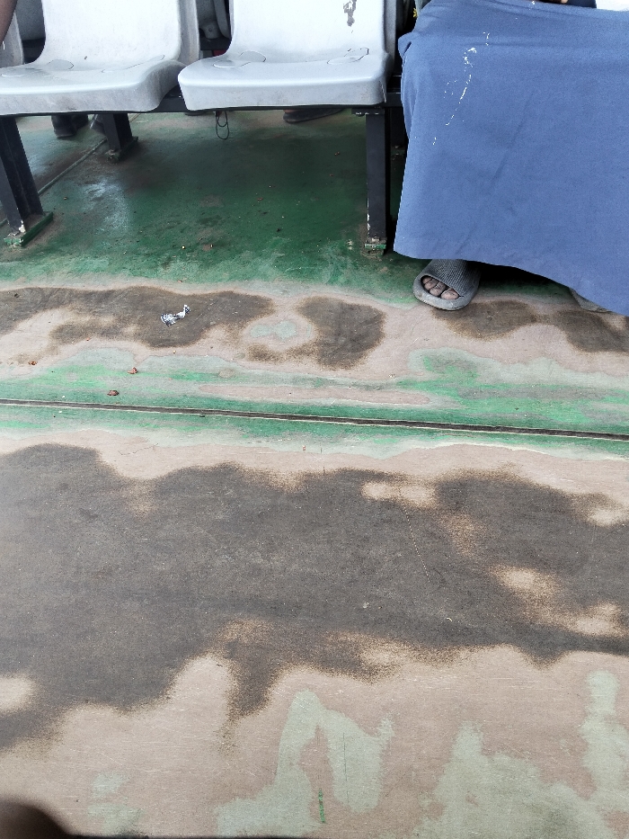 The scene depicts a ground-level view within an establishment in Mkomani ward, Kenya, likely a waiting area or public space. The floor is composed of a light green surface, heavily worn and discolored in patches, revealing a darker grey-brown substrate. Numerous irregular, dark, damp or stained areas are visible across the floor, along with scattered small debris and a crumpled white paper object. Two light grey plastic seats with black metal frames are positioned in the upper portion of the frame. To the right, the lower portion of a person is visible, clad in a dark blue garment that drapes over their legs, with one foot exposed, wearing a grey open-toed slide sandal. Beneath the seats on the left, the lower legs and dark footwear of another individual are partially discernible. No specific actions or interactions are depicted; the individuals appear to be seated or stationary.