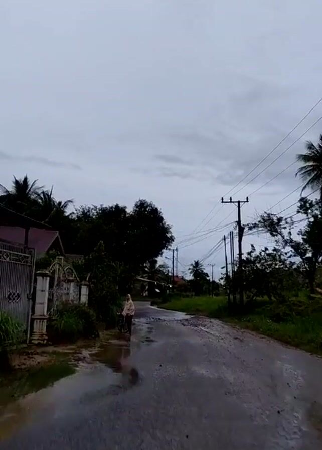 A rural road is flooded, with a woman in a headscarf walking through the water beside a bicycle. Palm trees, vegetation, and houses line the road, which is cracked and potholed. Power lines stretch across the sky, which is overcast.