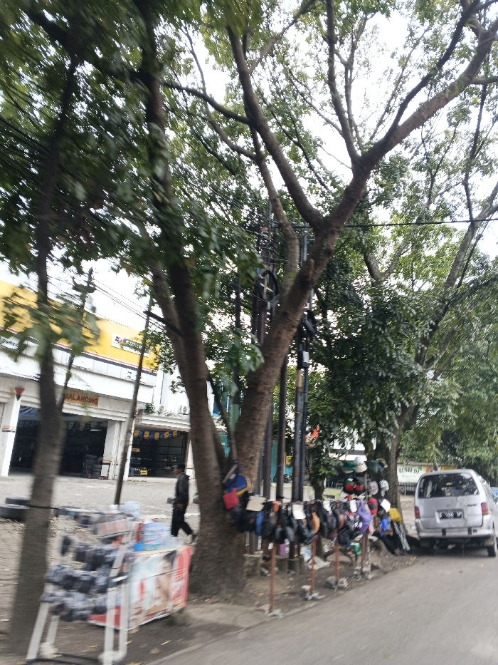 A street scene features lush trees lining the sidewalk. A man walks past a car parked along the curb, near a display of hats and bags hanging from a rack. In the background, a building with signage stands beside a tire shop. Overhead power lines are visible among the branches of the trees.