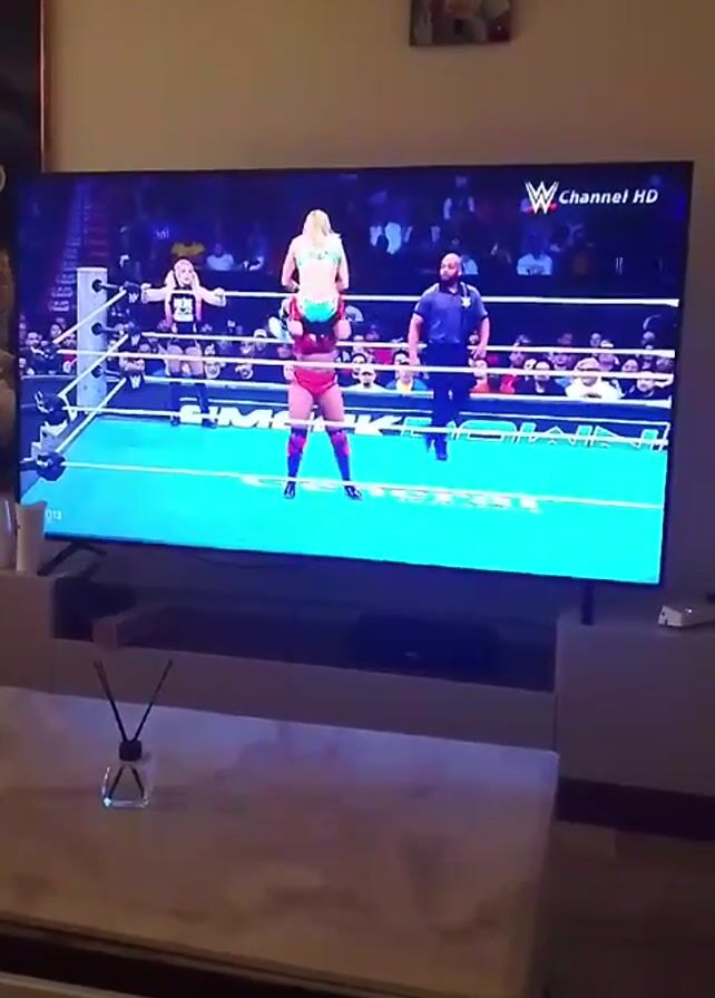 A wrestling match is being shown on a television. Two women are in the ring. One is wearing a red outfit and the other is wearing a blue and white outfit. The woman in red lifts the other woman over her head and then slams her down onto the mat. The woman in red then rolls over to pin the other woman. A referee is standing nearby. The television is on a stand in a living room. There is a coffee table in front of the television. There are other objects on the coffee table.