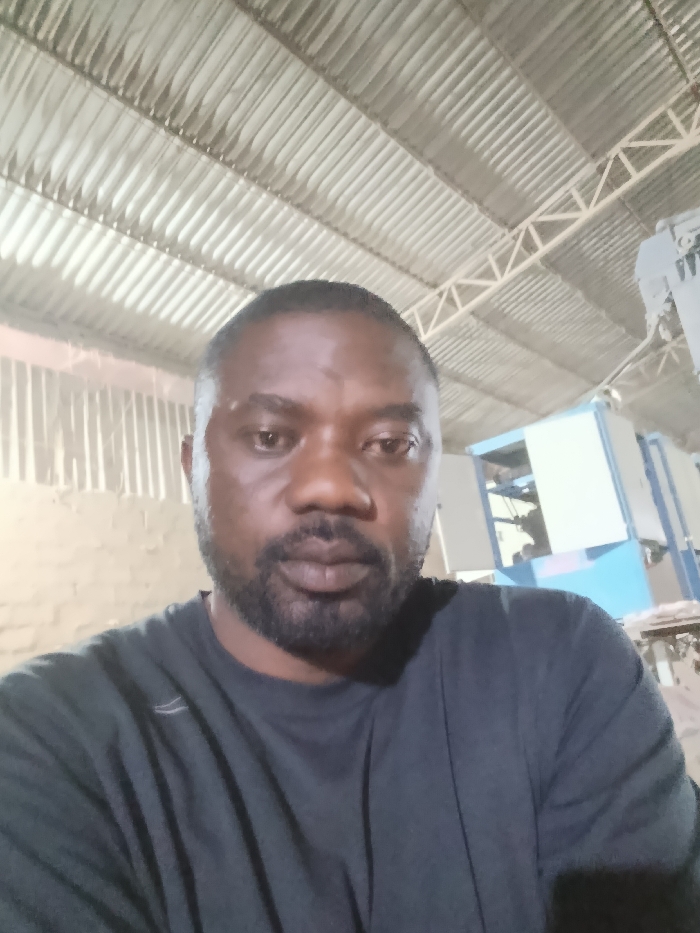 A man with dark skin and a beard is looking directly at the camera. He is wearing a dark gray t-shirt. Behind him is a warehouse or industrial setting, with metal support beams and ceiling panels visible. Some equipment is partially visible in the background, with blue and white paneling. The lighting appears to be artificial.