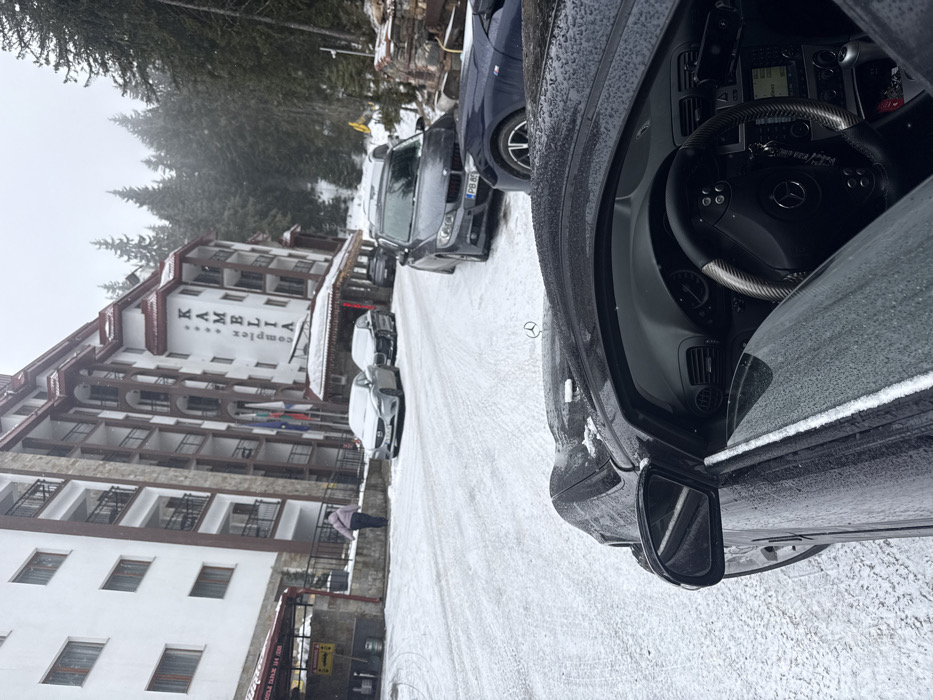 A winter street scene is depicted in front of Hotel Kamelia in Pamporovo, Smolyan Province, Bulgaria. The ground, including the road and surrounding areas, is covered with a layer of fresh snow, with visible snowflakes indicating ongoing precipitation. The primary structure is a multi-story hotel, "Kamelia," identifiable by its name prominently displayed vertically on the facade. The building features light-colored walls, multiple balconies with dark railings, and sections of a reddish-brown tiled roof. National flags, including the Bulgarian flag, fly near the main entrance, which is partially covered by an awning. To the right of the hotel, a dense coniferous forest covers a sloping terrain. In the foreground, the image is taken from the perspective of a black Mercedes-Benz CLK-Class vehicle, revealing part of its hood with a Mercedes-Benz emblem, the windshield, and the interior of the driver's side, including a steering wheel with carbon fiber accents and a central display. The car's exterior surface shows melted snow and water droplets. A blue two-door sports car, partially visible, is parked immediately to the right of the Mercedes. Further along the snow-covered road, a dark grey BMW 3 Series sedan with a Bulgarian license plate ("PB 80XX") is parked, facing the camera. A silver Mazda 6 sedan is parked closer to the hotel's main entrance, followed by a black Audi sedan. Several other less distinct vehicles are visible further down the road. On the left side of the road, a single individual wearing a light purple jacket and dark pants walks away from the camera, towards the hotel. Adjacent to this area is a small structure with a red roof, possibly a garage entrance, marked with Cyrillic text that includes "ГАРАЖ" (garage). Two large metal containers are positioned near this structure. Stone retaining walls covered in snow line the right side of the road.