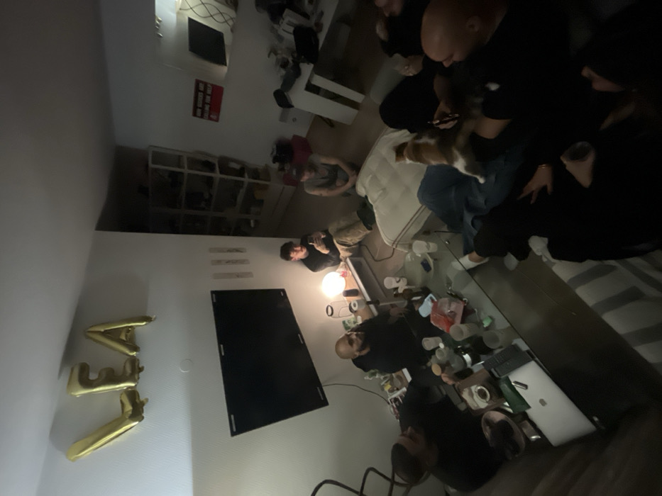 A gathering of people in a room is captured, seemingly candidly. A cat sits on someone's lap. A glass coffee table is cluttered with cups and electronics. Gold "LEA" balloons are visible against a wall featuring a dark panel. A bookshelf is partially seen in the background. The room's lighting is a mix of dim overhead lights and a warmer lamp.