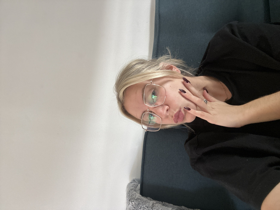 - "A blonde female, positioned from the chest up, is seated on a dark teal upholstered sofa against a plain light-colored wall" by FM-bcuvC3, licensed under CC BY 4.0