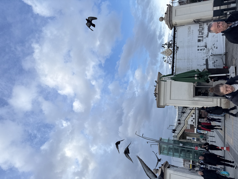 The image depicts an urban street scene in Zeytinburnu, Istanbul, Turkey, specifically near the "53. Yıl Sosyal Tesisleri" pedestrian overpass, viewed from a low angle under a partly cloudy sky. The sky occupies the upper portion, featuring patches of blue interspersed with white and grey cumulus clouds. Several dark pigeons are captured in various stages of flight across the sky, with one prominent pigeon in the upper right. In the midground, a modern pedestrian overpass dominates the central left. It features a transparent glass-encased elevator shaft on its left side and a staircase made of concrete and metal, ascending towards the right. Multiple individuals are visible walking up these stairs. To the left of the overpass, a white, classical-style architectural pillar or facade is partially visible, with pigeons perched on its upper edge. To the right of the pedestrian overpass, a prominent white, classical-style building stands. Pigeons are perched on its flat roof and ledges. A green folded umbrella is leaning against the building, partially obscuring a large white banner displayed on its facade. The banner features black and white photographic imagery and Turkish text, visibly stating "53. CUMHURİYET SOSYAL TESİSİ TOPLANTI VE DAVET SALONU" (53rd Republic Social Facility Meeting and Event Hall). Above this banner, an ornate black metal decorative element incorporates the Istanbul Metropolitan Municipality logo. A small white kiosk or booth is integrated into the front of this building, left of the umbrella. The foreground consists of a paved pedestrian area. In the bottom center, a woman with dark hair in a dark jacket is partially visible, looking down. In the bottom right, a man with grey hair in a dark jacket is also partially visible, looking down. Numerous other pedestrians, dressed in casual dark attire, are walking on the paved surface, some moving towards the foreground. An orange traffic cone is present on the paved area in the mid-left.