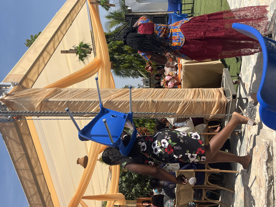 This image depicts an outdoor social gathering under a temporary canopy structure, located in Kumasi, Ghana. The scene is bright and sunny. A large, rectangular canopy, constructed with metal trussing and covered in light beige fabric, features draped orange-gold sheer fabric decorations beneath. A prominent structural pillar, wrapped in matching orange fabric, stands in the mid-left foreground. A metal chain hangs vertically from the canopy truss near this pillar. A blue plastic chair is suspended upside down, its legs pointing upwards, adjacent to the chain. Another blue plastic chair is partially visible on the ground in the lower right corner. The ground surface transitions from light-colored flagstones in the foreground to artificial green turf where guest tables are set. Palm trees and other foliage, along with a dark metal gate, are visible in the background under a clear blue sky. Approximately ten to fifteen individuals, primarily women, are present. In the left foreground, a woman, seen from behind, walks right-to-left. She wears a black dress with white, red, and green floral patterns. She has a small white bag slung over her left shoulder and holds a grey pom-pom keychain in her right hand. She wears one light-colored sandal on her right foot, while her left foot is bare. In the right foreground, another woman, seen from behind, stands facing slightly left. She has long, dark braided hair and wears a top with blue, orange, and red geometric patterns over a long, layered maroon lace skirt. She appears to be adjusting her hair or headwear. Further back, several tables are arranged, each covered with a light brown tablecloth and adorned with floral centerpieces in shades of pink, orange, and red. Guests are seated at these tables on woven wicker chairs, engaged in conversation or observation.