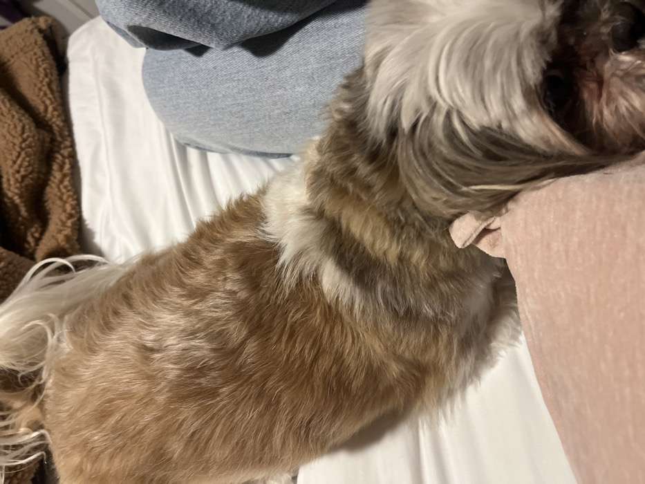 A Shih Tzu rests on a bed