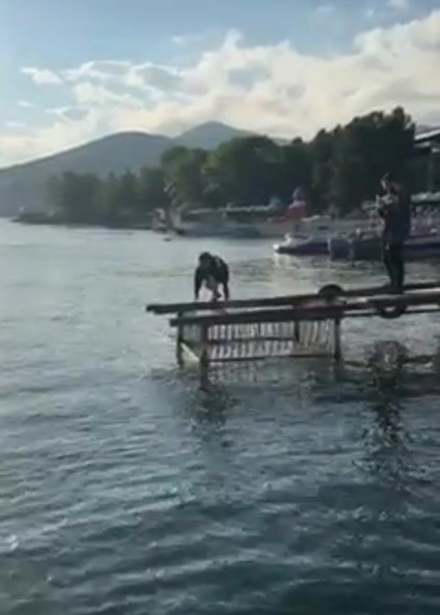 Two people stand on a small dock on a lake. One person, wearing dark clothing, stands on a small platform at the end of the dock, seemingly preparing to jump into the water. The second person, also in dark clothing, stands further back on the dock, facing the first person, possibly filming with a phone. The lake is rippled, reflecting the blue sky and clouds. In the background, there are trees, buildings, and mountains, with boats docked along the shore. The scene is outdoors, and the lighting suggests it is daytime.