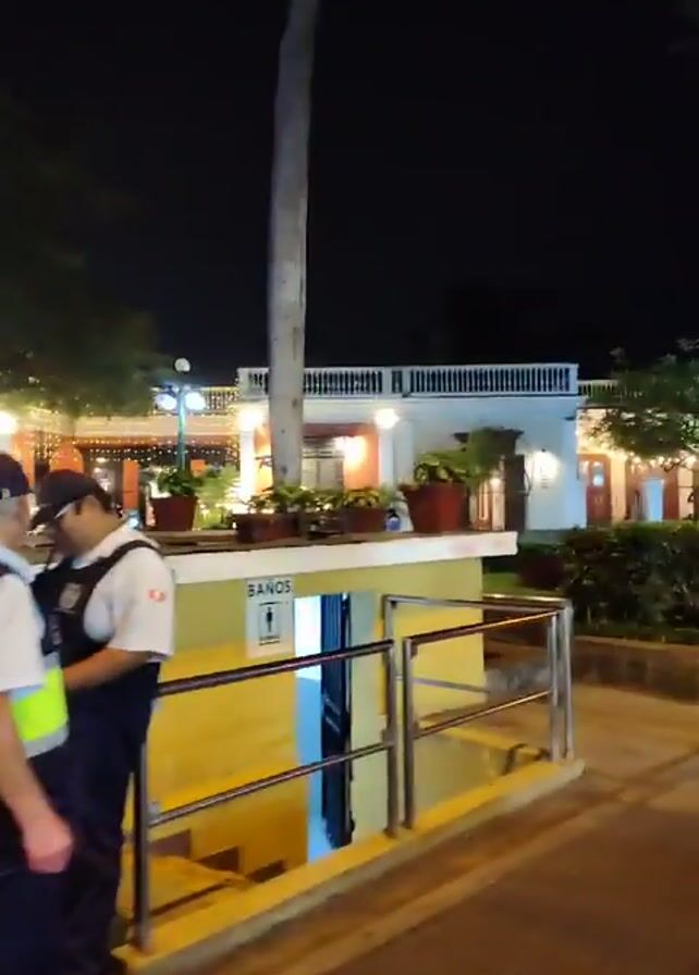 The video depicts a nighttime scene in a park. Initially, two uniformed security personnel are visible standing near a restroom entrance. The camera then pans across the park, revealing illuminated buildings, trees, walkways, and people walking or sitting. The camera focuses on a street with cars passing and a building in the background. The scene is well-lit, and the camera movement is continuous.