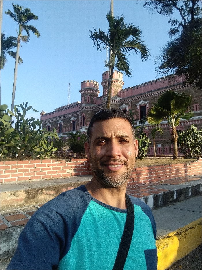 A man smiles in a selfie, standing in front of a pink and brown building with two round turrets on the corners. Palm trees frame the building. A low brick wall is behind the man, separating him from cacti and other plants. He wears a blue and teal raglan shirt with a black strap across his chest. A yellow curb and brick pavement are visible in the foreground. The sky is clear and blue.