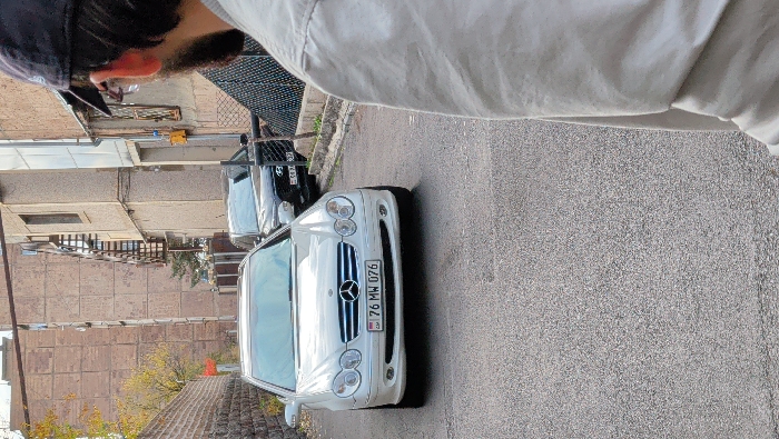 The image depicts a narrow, asphalt-paved urban residential street in Yerevan, Armenia. In the foreground, viewed from behind the right shoulder, is a person with dark hair and a beard, wearing a dark baseball cap, glasses, and a light-colored collared garment. This individual faces away from the camera, looking down the street. A white two-door Mercedes-Benz CLK-Class coupe is parked on the right side of the street, facing the viewer, displaying Armenian license plate "76 MW 076". Its windshield is covered with a reflective sunshade. Further down the street, behind the Mercedes, a dark-colored Hyundai SUV is parked, with a partially visible Armenian license plate "88 CR 722". On the left side of the street, a brick wall extends into the mid-ground, beyond which a tree with yellow-orange autumn foliage is visible. In the distant background, a tall, multi-story concrete building with a grid-patterned facade is present. On the right side of the street, a low chain-link fence separates the roadway from a sidewalk area. Behind this, a light-colored building with external metal fire escapes or balconies is visible, along with a smaller structure featuring a yellow utility box on its exterior. The street surface is dry, paved asphalt. The scene is illuminated by daylight, suggesting clear or partly cloudy conditions.