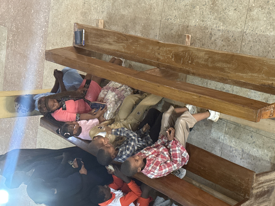 An indoor scene in Rafin Par, Nigeria, depicts nine individuals seated on two parallel wooden benches