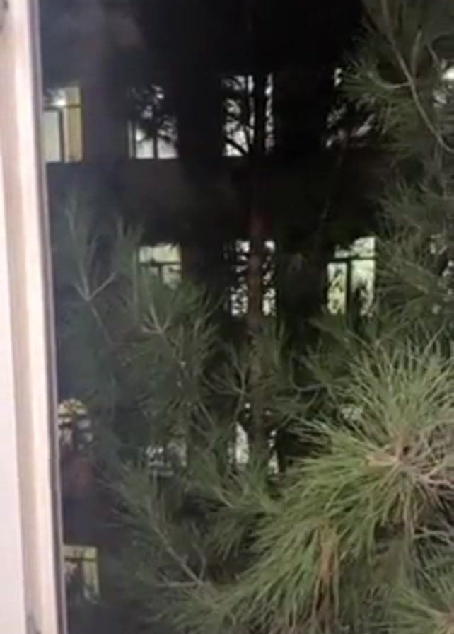 The video is a static shot from a window looking out onto a pine tree at night. Visible behind the tree are lit windows in a multi-story building. Music is audible. The video appears to have been taken from inside a building, looking out at the exterior environment.