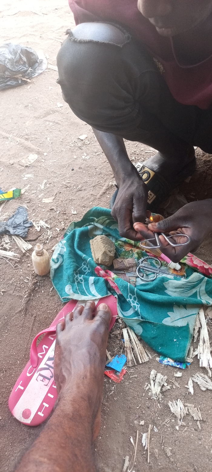 A person crouches over a colorful cloth on the ground. They hold a lighter and small scissors in their hands, possibly preparing or using drugs. A tan, brick-like substance and a small bottle sit on the cloth. The person wears dark pants with a ripped knee and designer sandals. A bare foot in a sandal is also visible. Debris and trash are scattered around the area.