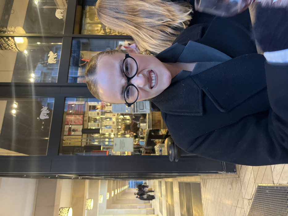 A blonde-haired woman in glasses and a black coat smiles with clenched teeth towards the camera. She stands near a building with large windows displaying merchandise inside. Reflected in the windows are lights and a long hallway with people walking. Part of another person's blonde hair is visible above the woman's head. A partial glass of a dark liquid appears in the upper right of the frame.