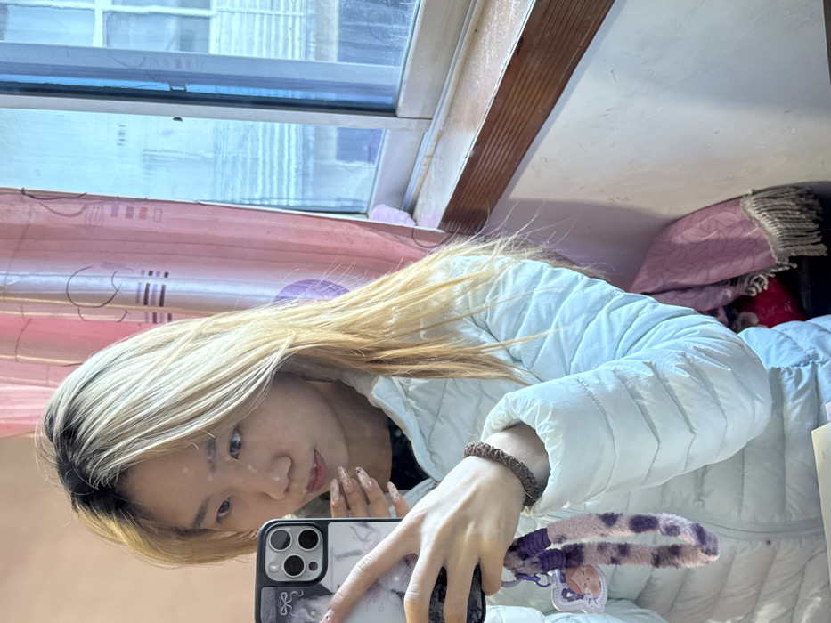 A young woman with blonde and black hair takes a selfie. She wears a light blue puffer jacket and a brown braided bracelet. Her manicured hand holds an iPhone with a marble-patterned case, displaying a lanyard featuring a character. Behind her, a window with a view of an apartment complex, adorned with a pink curtain, and a glimpse of a bed with pillows and blankets can be seen. The scene is bathed in soft, natural light.