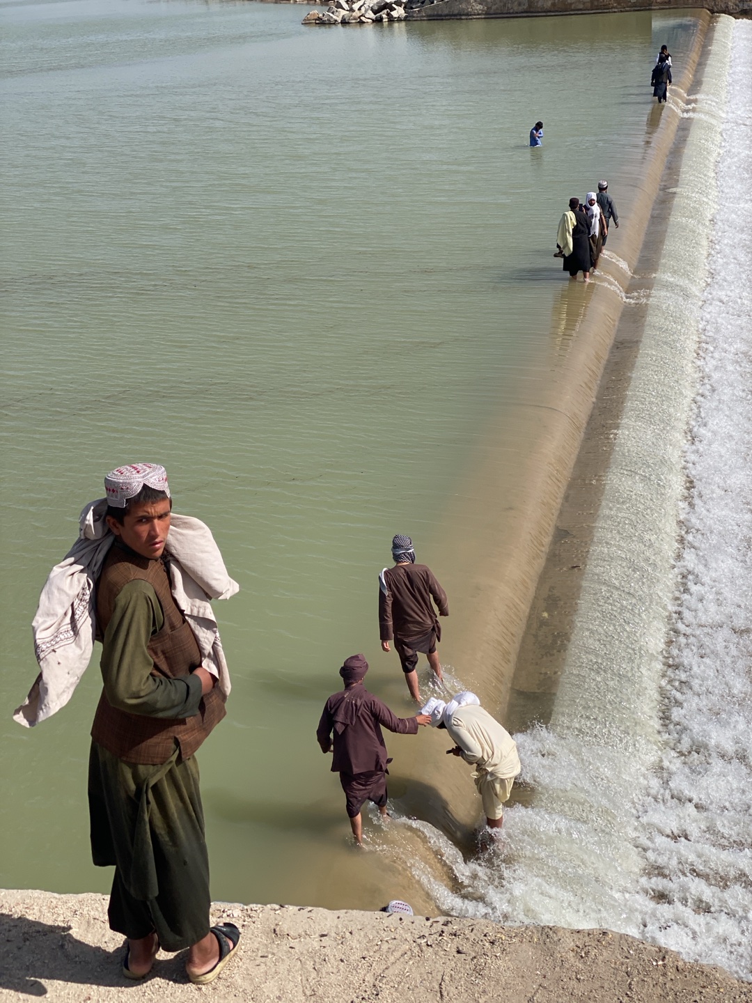 The image captures a scene near Kim, Afghanistan. In the foreground, a young man stands on a concrete ledge, his attire consisting of dark green pants and shirt, a brown vest, sandals, and a patterned head covering. He has a light-colored cloth draped over his left shoulder. To his right, three individuals are wading in shallow water as they traverse a concrete dam. One is wearing a brown outfit and turban, reaching out to assist another person in a light-colored outfit and turban, who appears to be navigating the flowing water. A third person in a brown outfit and turban follows behind. Further along the dam, a group of people dressed in dark clothing is walking along the structure. In the distance, a solitary figure is standing in the water, and another group is near the opposite bank. The water is a murky green, and the dam has water flowing over its edge. The sky is light, indicating daylight.