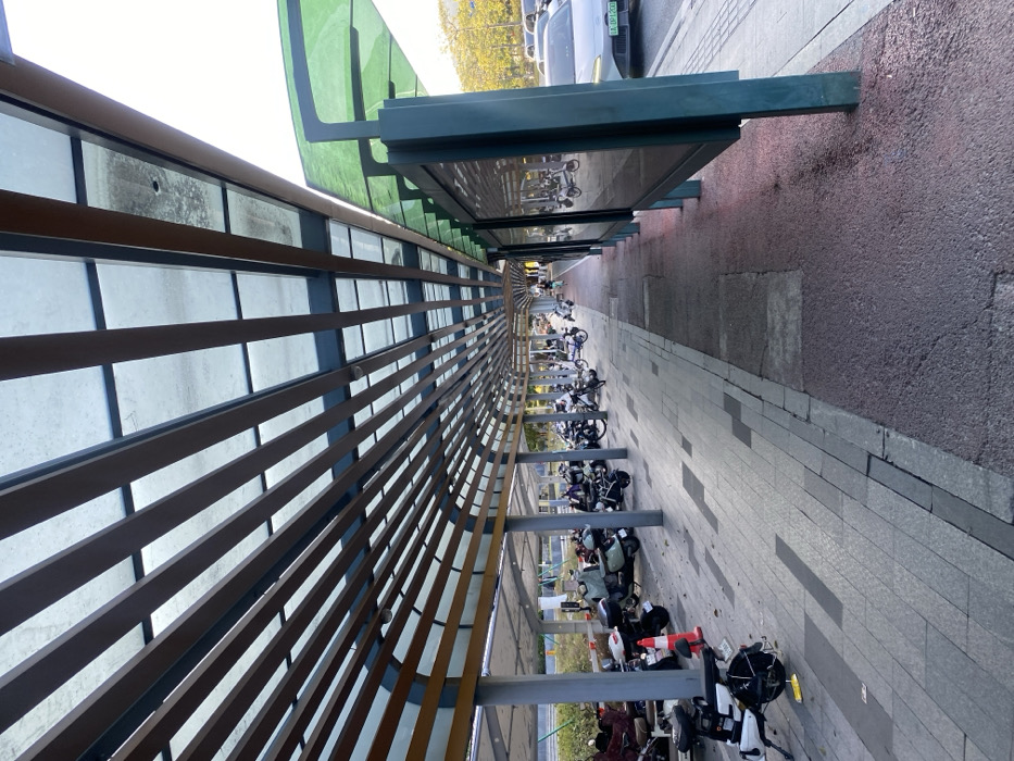 The image depicts an urban outdoor environment in Huangpu District, China, under daylight conditions. The scene is dominated by a long, arc-shaped shelter with a translucent, possibly dirty, roof structure supported by grey pillars. Beneath the roof, a series of parallel horizontal brown slats are visible, creating a lattice pattern. On the left side of the frame, underneath this main shelter, a paved area with grey and darker grey rectangular tiles serves as a parking space. Numerous electric bicycles and scooters are parked in rows, facing towards the background. The vehicles display a variety of designs and colors, primarily dark tones. On the far left, partially obscured by the parked vehicles and pillars, several individuals are visible, appearing to be seated or resting. A single orange and white traffic cone stands on the tiled pavement in the mid-ground on the left. To the right, running parallel to the main shelter, is another structure featuring a series of vertical, dark-framed display panels, possibly advertising billboards or information screens, with reflections of the parked vehicles visible on their surfaces. This structure is topped by a separate, green-tinted transparent canopy. Adjacent to these display panels is an asphalt road. A light-colored sedan, likely white or silver, with a visible license plate starting with "A.ZP1200", is on the road in the mid-ground. Additional vehicles are visible further down the road in the background. Deciduous trees with autumn foliage are present in the far background on the right.