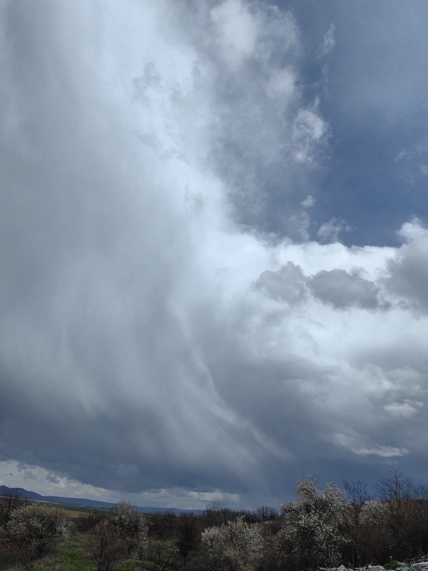 The image depicts an expansive natural landscape on the outskirts of Saedinenie, Bulgaria, under a dynamic sky. The majority of the sky is dominated by a vast, dark grey cloud mass exhibiting complex, undulating formations, particularly prominent across the left and central portions of the frame. Patches of clear, light blue sky with scattered white cumulus clouds are visible in the upper right quadrant. The distant horizon to the left features a line of dark hills or mountains. The foreground consists of dense vegetation, primarily deciduous trees and shrubs. Many of these trees are in full bloom, covered in white blossoms, indicating a spring season. Areas of green ground cover are visible between the vegetation. In the lower right corner, an accumulation of miscellaneous discarded items and refuse is present. No people, animals, or explicit actions are observed.