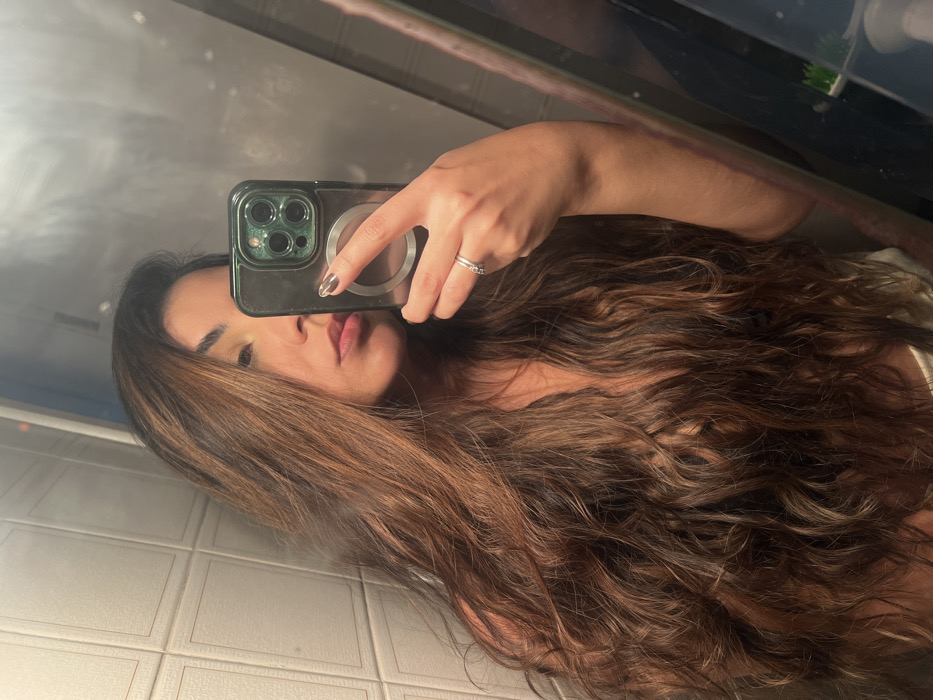 A female subject is captured in a mirror selfie, facing forward with her head slightly tilted. She has long, wavy dark brown hair with lighter auburn highlights, cascading over her shoulders and chest. Her right arm is raised, holding a dark-colored smartphone, possibly an iPhone 14 Pro or 15 Pro based on the triple camera array, encased in a transparent MagSafe case with a visible circular magnetic component, reflecting her image. Her left hand is visible, wearing a ring with multiple small stones on her ring finger, and her fingernails are painted with dark metallic polish. She has medium skin tone, and her lips are slightly parted. A portion of a light-colored garment, possibly white or cream, is visible below her chest. The background visible in the mirror consists of white square wall tiles on the left side and a reflective, potentially metallic or glass, surface on the right, suggesting an indoor environment such as a bathroom or dressing area. No identifiable features are present in the image to determine a specific location within the city of Recife, Brazil.