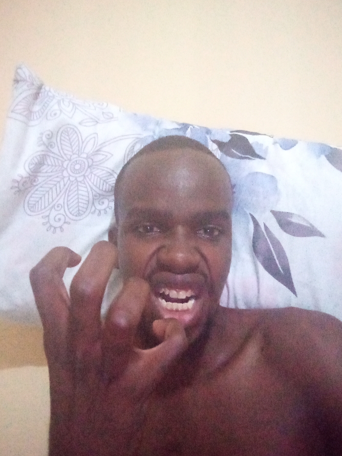 A shirtless dark-skinned man lying against a floral pillow is captured in a close-up selfie. His face is contorted in a grimace or snarl, displaying his teeth. His hand is raised near his face, fingers curled and tense, adding to the aggressive expression. The background is blurred, with a plain wall visible at the top. The lighting is somewhat muted, giving the image a slightly grainy texture.
