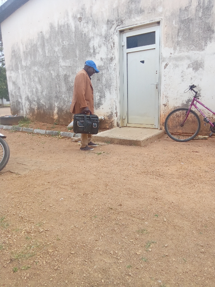 A man in a tan jacket and blue cap stands near a white building with a closed white door. He carries a black briefcase in his left hand. A purple bicycle leans against the wall to the right of the door. The ground is dirt. Part of a motorcycle wheel is visible to the left. The wall has a mottled, aged appearance.