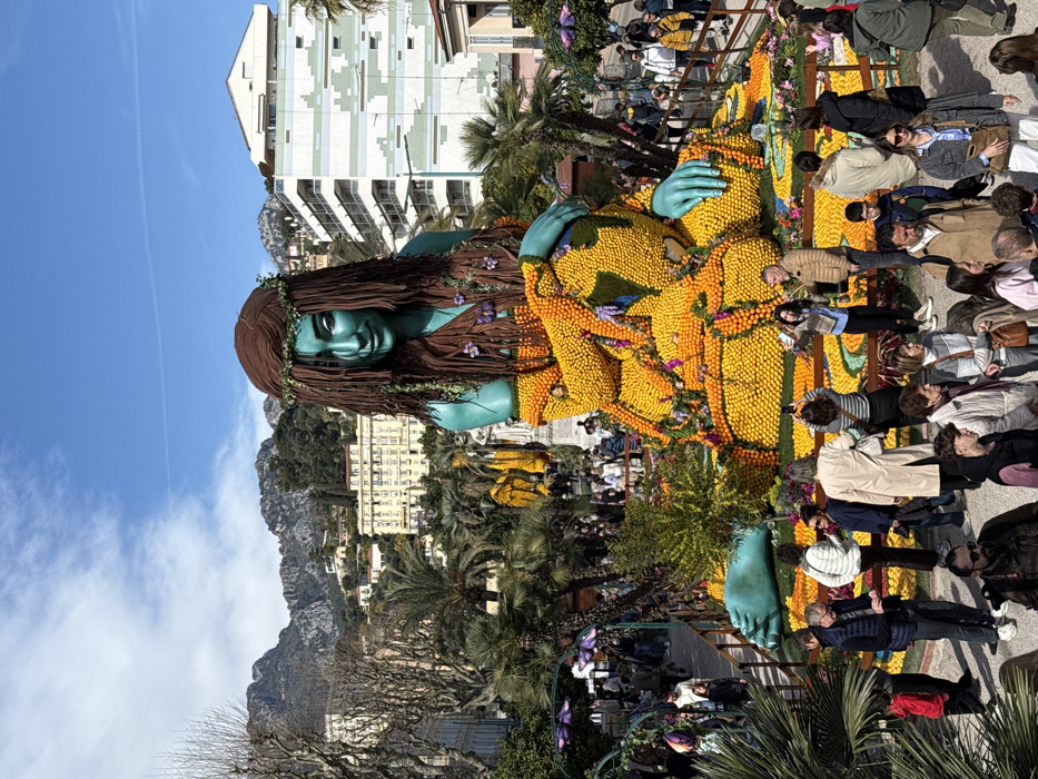 A large outdoor display in Menton, France, features a monumental sculpture of a seated female figure